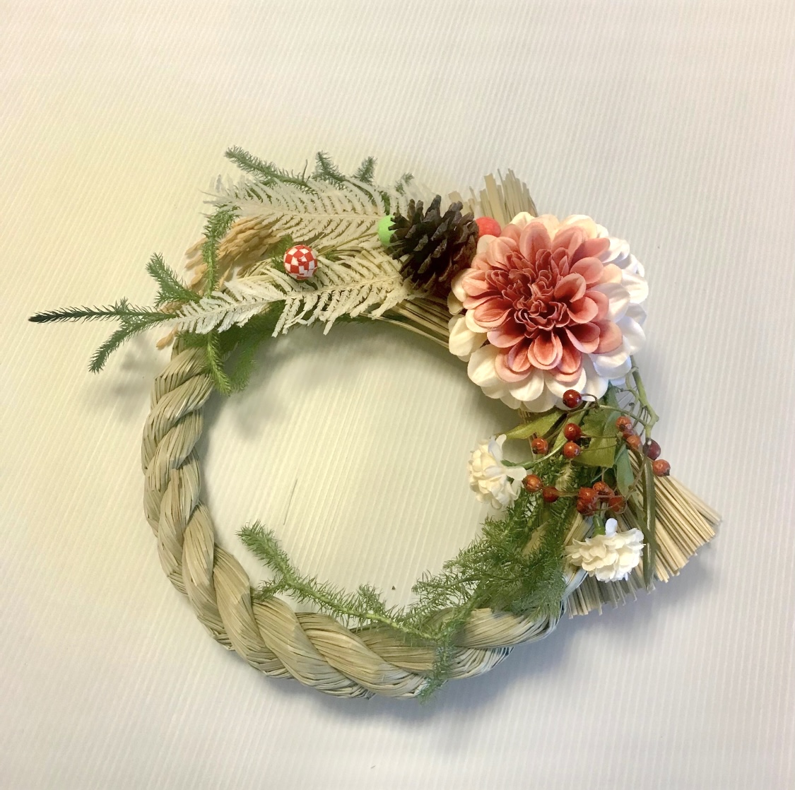 「おたすけママ」にていけばなレッスンを行っている岡田先生による初めての年末特別企画!<しめ縄リース講習会>アーティフィシャルフラワーとフレッシュグリーンを合わせたステキなデザインです。